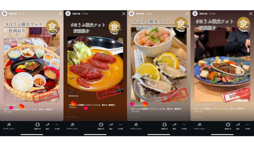 当協会の公式Instagramアカウント「たびたびほうふ」 のストーリーで、投稿写真を紹介します。「ストーリーズで引用」という機能を使い、編集で専用の枠をつけての紹介となります。