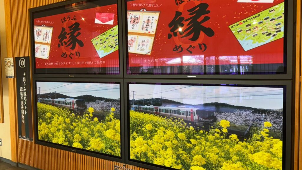 まちの駅うめてらすの休憩コーナーにあるモニターで、ほうふ観光フォトに投稿いただいた写真や動画を紹介しています。※1つ前のシーズンの投稿をスライドショー形式で放映しています。